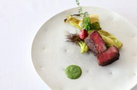 パスタの前にメイン料理をいただきます。ブラックアンガス牛のグリルです。グレーターオマハの良質なアンガス牛を使用しています。理想的な飼育環境で長期にわたり肥育された牛で、サシ回りがよく、甘みが加わり、日本人好みの仕上がりになると言われています。ソースはルッコラとジャガイモのピューレソース。とてもさわやかなソースです。付け合せは沖縄県産のヤングコーン。是非ひげまでお召し上がりください。ラディッシュは兵庫県産の農薬未使用のもの。