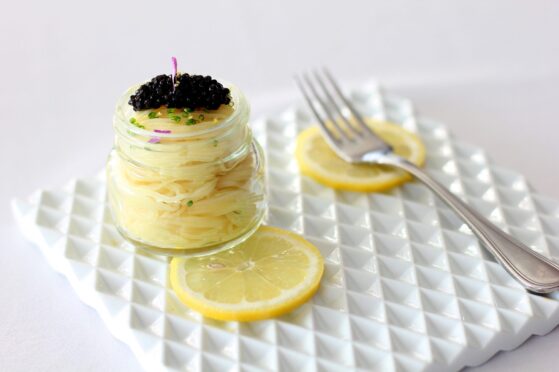 冷製カッペリーニに合わせたソースは特製ヴィネグレットソース。とても爽やかなソースのポイントには、沖縄県などで最近は栽培され始めたと言われているカラマンシーを使っております。カラマンシーは「奇跡の果実」と呼ばれるほど、栄養価が高く、シークワーサーの約8倍もビタミンCが含まれるとか。美容に期待できますね。これにイタリア産のキャビアをトッピングしました。塩味と酸味のバランスがちょうどいい一皿です。