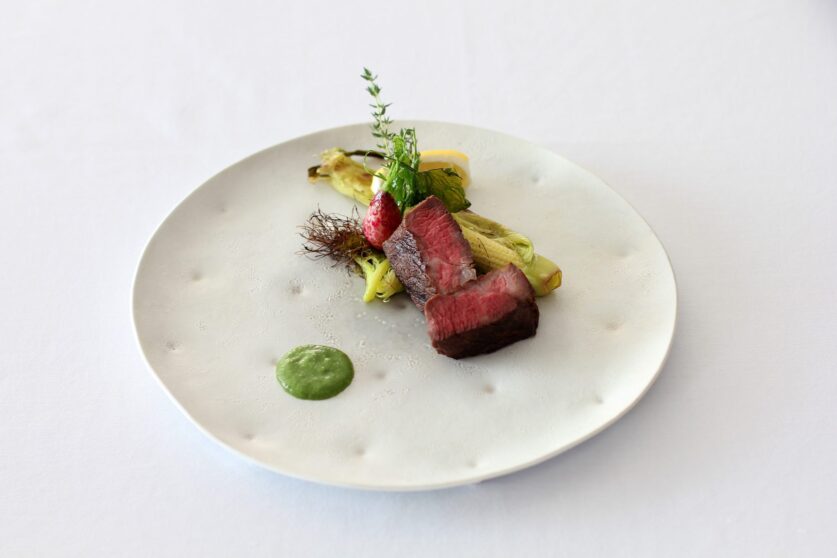 パスタの前にメイン料理をいただきます。ブラックアンガス牛のグリルです。グレーターオマハの良質なアンガス牛を使用しています。理想的な飼育環境で長期にわたり肥育された牛で、サシ回りがよく、甘みが加わり、日本人好みの仕上がりになると言われています。ソースはルッコラとジャガイモのピューレソース。とてもさわやかなソースです。付け合せは沖縄県産のヤングコーン。是非ひげまでお召し上がりください。ラディッシュは兵庫県産の農薬未使用のもの。