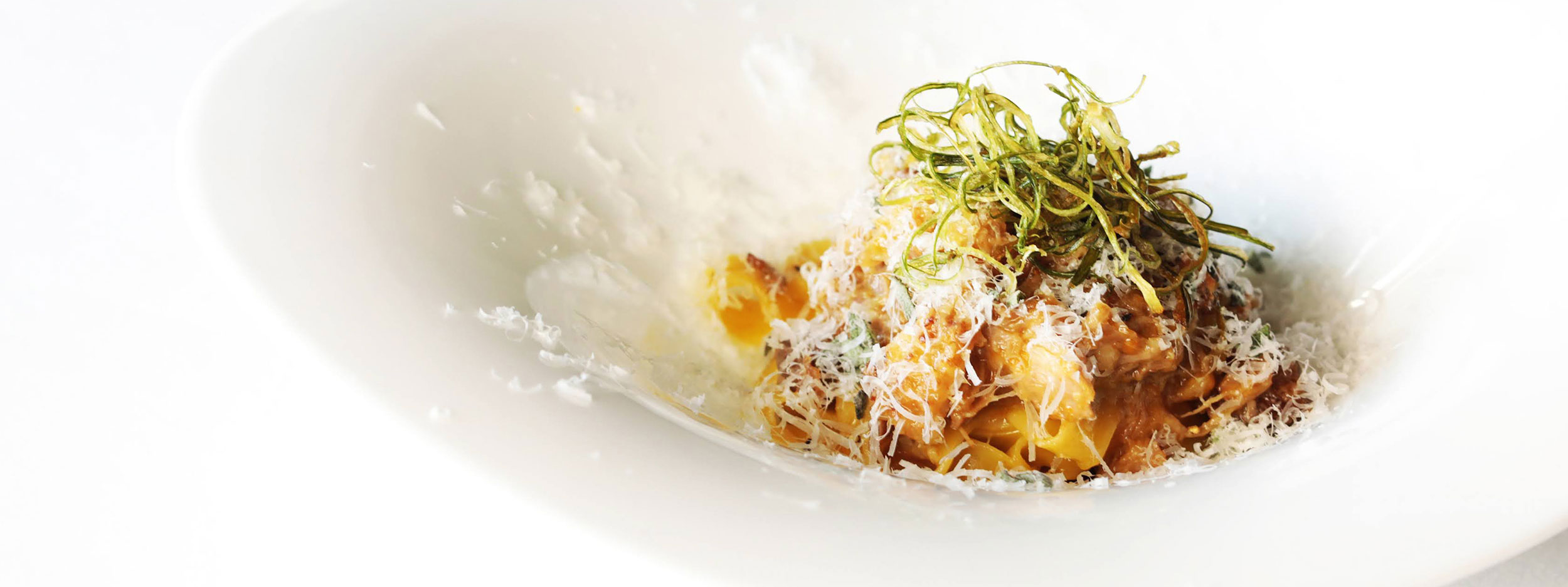 比内地鶏のラグーに雪中ネギを合わせ、旨味と香りを引き立てたタリアテッレのパスタ。