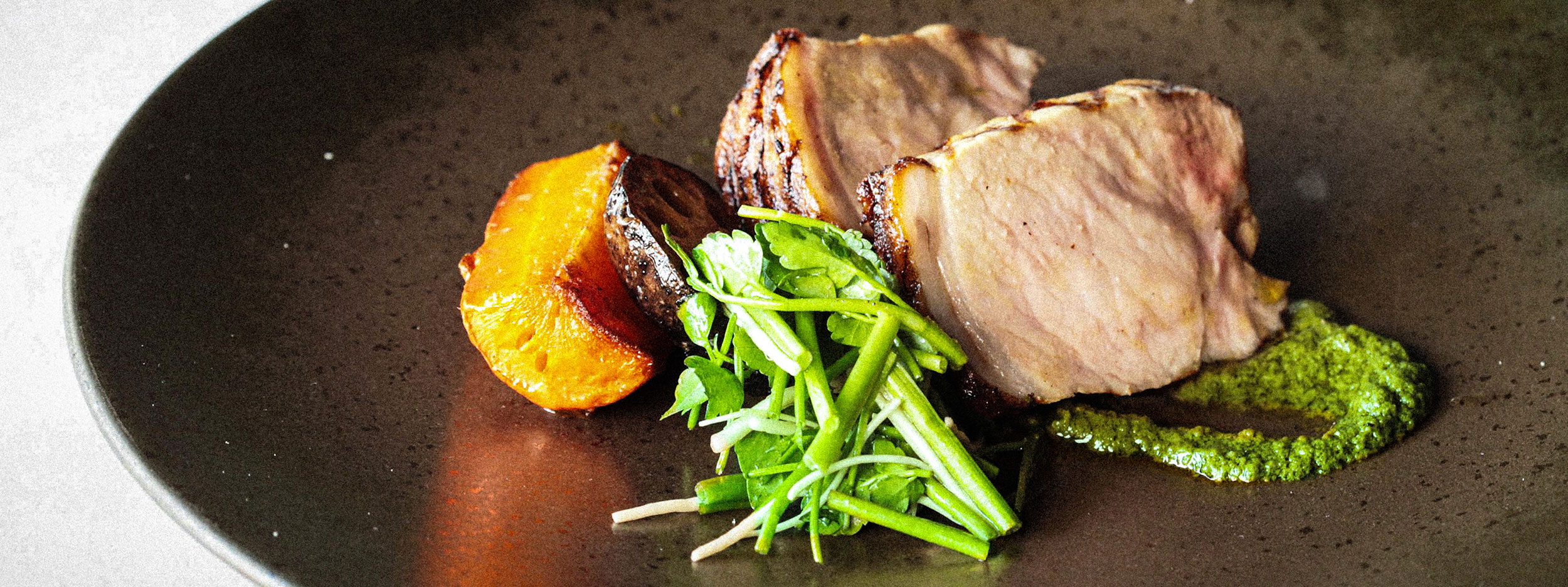 旨味の強い十豚(じゅっとん)を香ばしく焼き上げ、芹の風味を生かしたソースで仕上げた一皿。