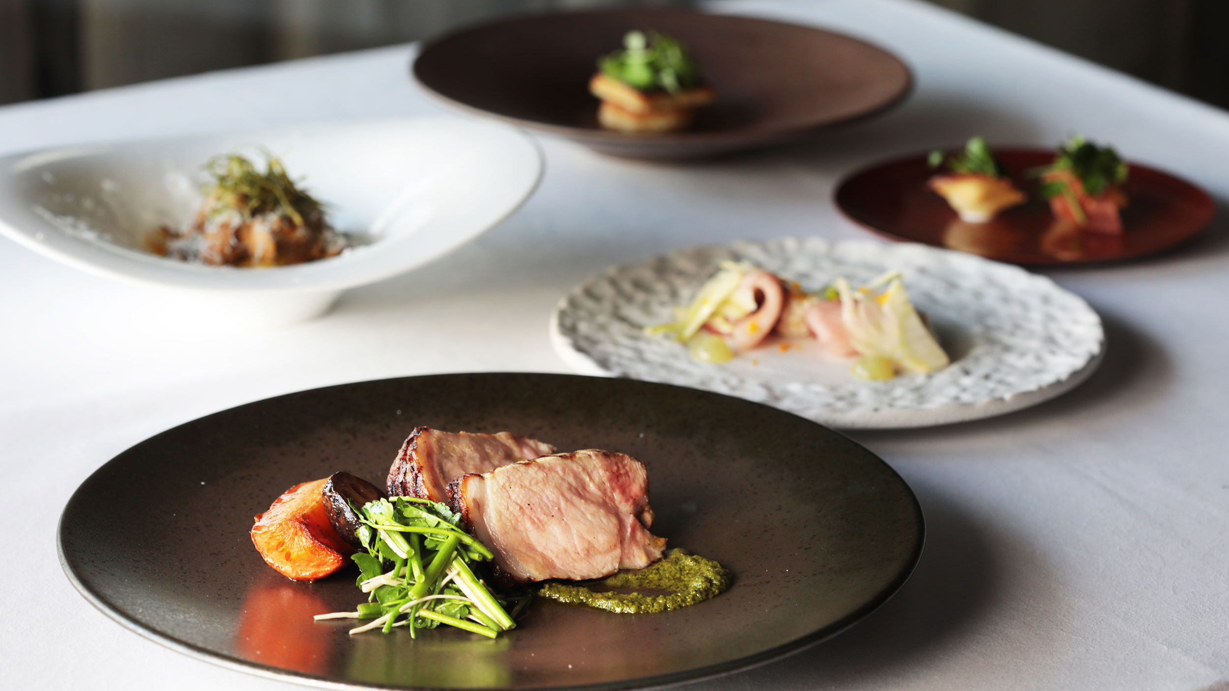 丸の内エリアを見渡す眺望とともに、秋田県産食材の魅力を生かしたコースおよびアラカルトメニューをお楽しみいただけます。