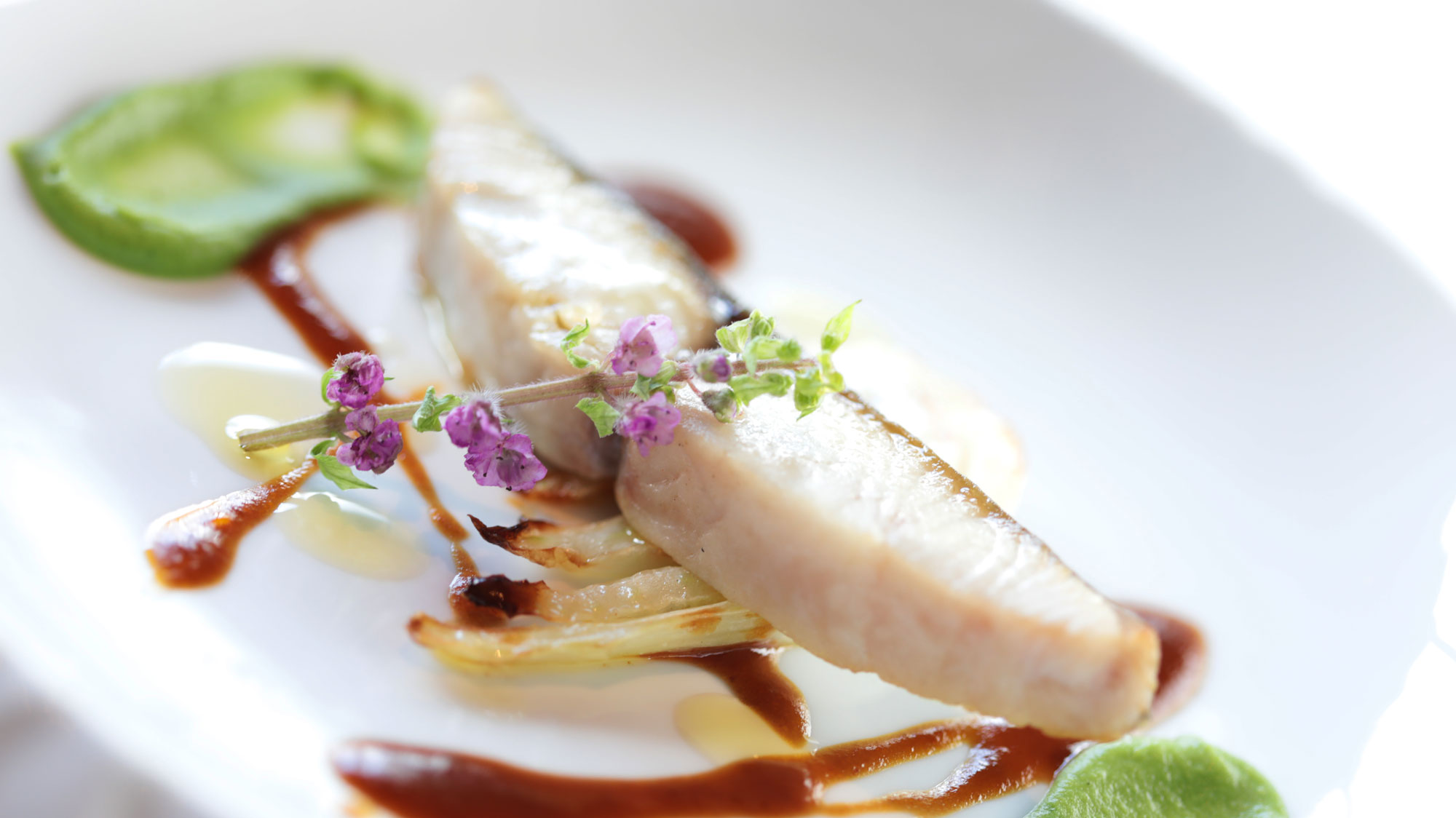鰆に氷見鰤魚醤の旨みを重ね、フェンネル×トマト×アニスシードのソースで香りとコクをプラス。ブロッコリー、アーモンド、エストラゴンソースと花穂紫蘇の香りで爽やかに仕上げます。